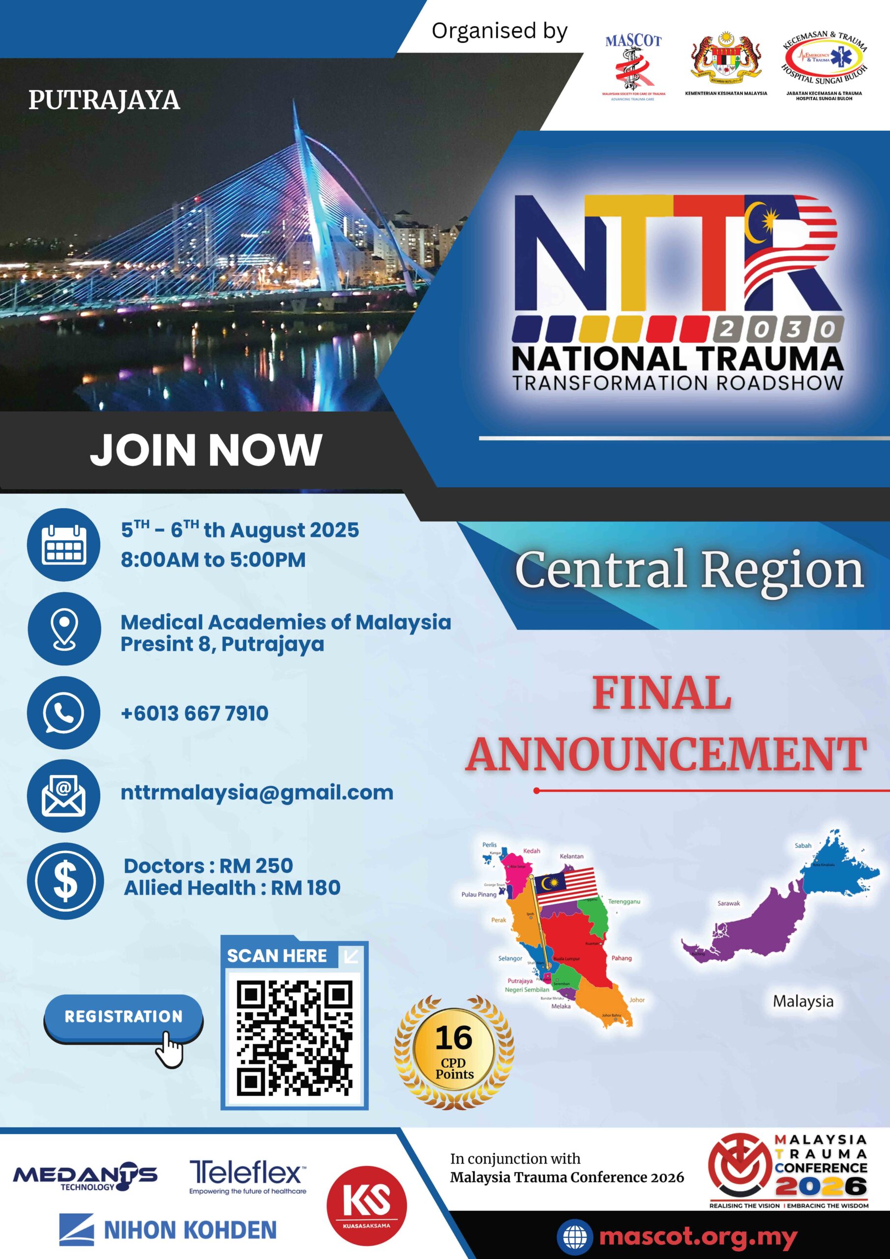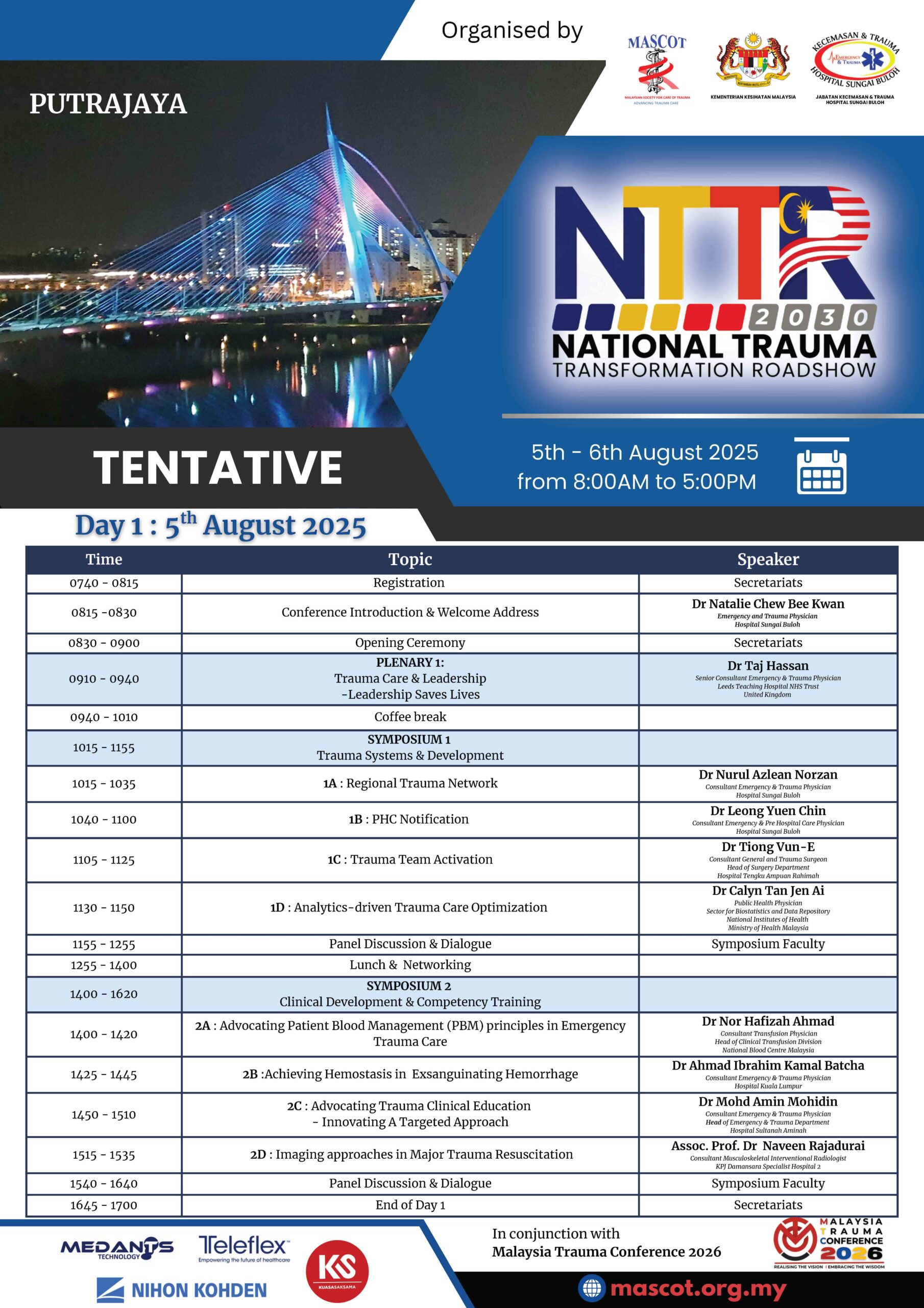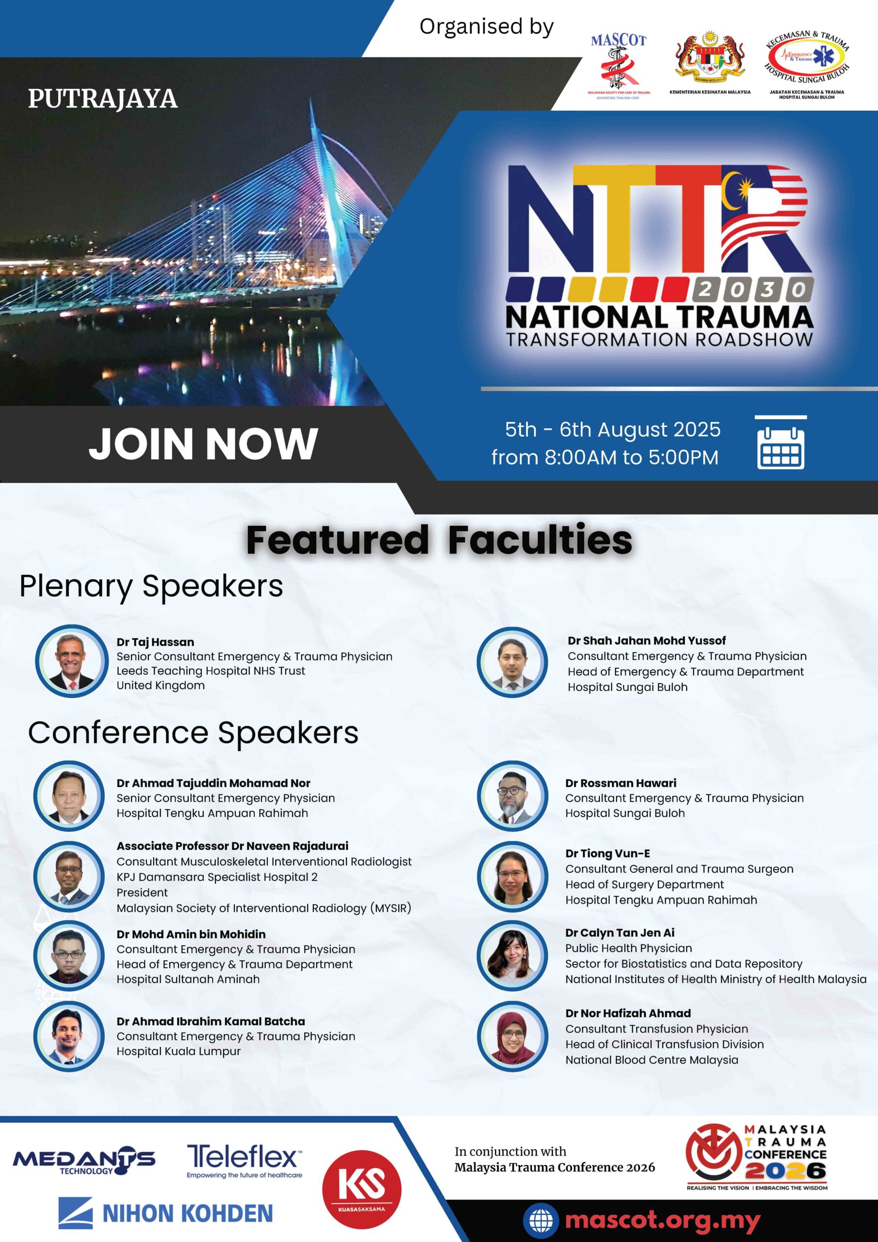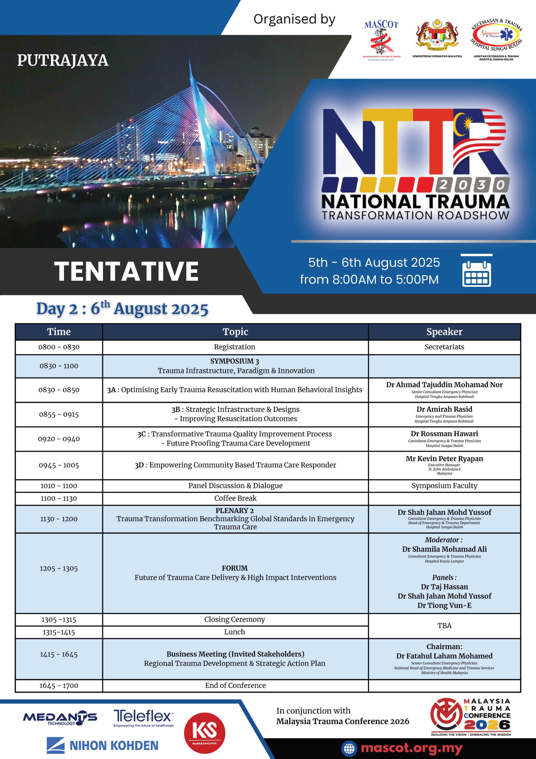 The National Trauma Transformation Conference Roadshow (NTTCR) 2025 – 2026 : Benchmarking Global Standards in Emergency Trauma Care is a Malaysian initiative to enhance emergency trauma care by aligning local practices with global standards. Recognizing trauma as a major cause of death and disability, the roadshow aims to improve trauma care standards, foster continuous improvement, and equip healthcare providers with the latest knowledge and skills. this roadshow seeks to bridge the gap between current practices and global benchmarks, positioning Malaysia at the forefront of emergency trauma care excellence.