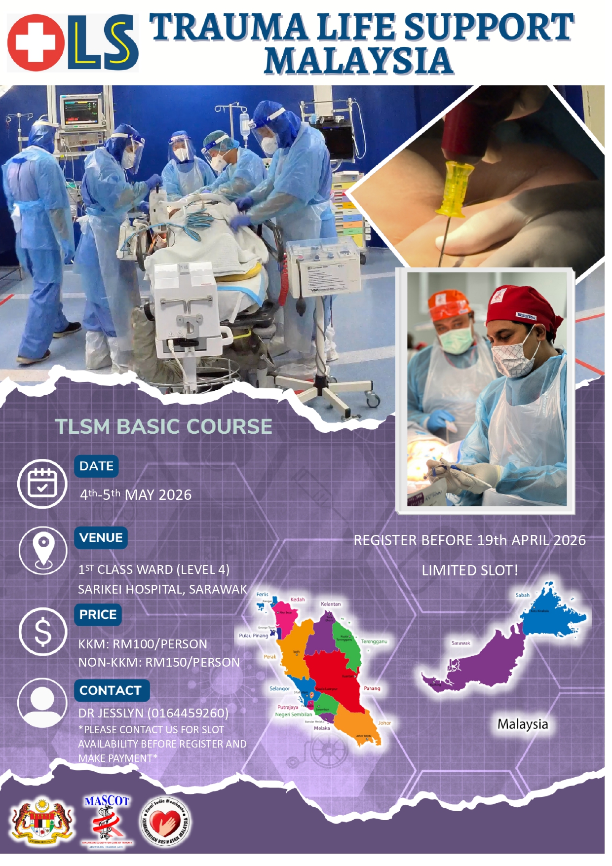 Thank you for your interest in our TLSM Sarikei Basic Course 2026 organised by Persatuan Perubatan Kecemasan Sarikei and Sarikei Hospital. This basic course is open to whole Sarawak and kindly contact the person in charge stated in the flyer to confirm slot before providing the registration link.